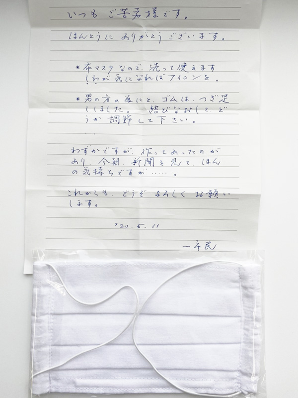 先日に引き続き、今週もたくさんの温かいお言葉と手作りマスクまでいただきました! ありがたいの一言です。 皆さまに支えられて、このお仕事をさせていただいていることに改めて気付かされます。 本当にありがとうございます!! PS パッカーくんもしっかり予防をしています! みんなで憎きウイルスに打ち勝ちましょう!